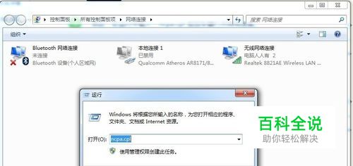 开始→运行→输入:ncpa.cpl 按回车键打开网络连接。