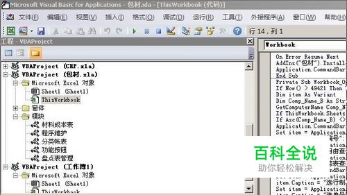 在左上角找到“工程-VBAProject”窗口(没找到,按组合键CTRL+R会出现),在窗口中用鼠标双击VBAProject(包材.xls)下的ThisWorkbook