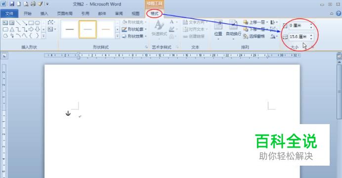 设置线条大小. 选中显小以后,在功能区中,点击"格式",找到"大小"的选项,把高度设置为"0"cm,宽度设置为"15.6"cm,完成大小的设置.