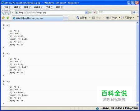 例PHP中使用MySQL数据库(mysql.php) <?php//连接MySQL数据库 mysql_connect('localhost', 'root', '123'); //选择当前数据库 //等效为执行USE test mysql_select_db('test'); //在当前数据库执行SQL语句 $query = "SELECT * FROM students"; $result = mysql_query($query); //操作上次查询返回的结果集,注意$result变量一般是需要的 while($student = mysql_fetch_array($result)) { echo '<pre>'; print_r($student); echo '</pre>'; } ?>