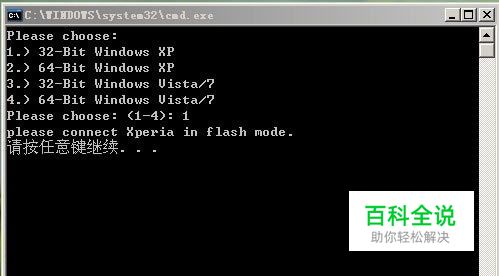 运行强刷包内的X10flash.bat文件。在弹出的CMD对话框中选择你的系统(按对应的数字,然后回车)。选着好系统以后会看到下面的对话框,让你按任意键继续,这个时候不要动。