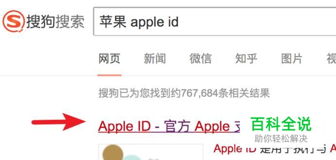 打开搜狗搜索,输入‘苹果 apple id’进行搜索,点击打开官方网站。
