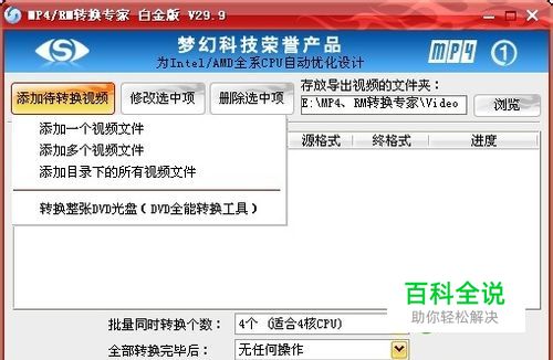 导入要观看的视频文件 在软件主界面上,点击左上角的“添加待转换视频”按钮,软件支持添加单个视频、多个视频和目录下所有视频等多种添加方式,在设计上非常人性化。《MP4/RM转换专家》几乎支持所有格式的视频导入,所以一般从网上下载的视频都能直接添加。 这款软件最先开发并使用了多核CPU并发转换技术,最高支持到16核心优化,是业界转换速度最快的软件,无论是单个转换还是多个并发转换,都能快速完成。另外,它还自带一款《DVD全能转换》工具,支持将DVD光盘按标题、章节转换成ipad、ipad2 、iphone的官方标准MP4格式,还能转换成3GP等视频格式,以在手机等移动硬件上观赏。