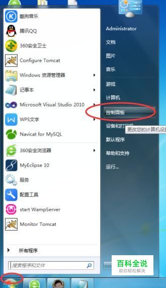 控制面板 点击电脑左下角的【开始】图标,在弹出的窗口中选择【控制面板】,如下图所示: