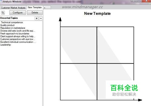 MindManager分析视图通过优化排列导图主题帮你做出更好的选择,将所选的主题显示在显示自定义的2x2分析图表,使用图表的轴值作为标准,通过拖放主题位置反映他们之间的等级排名,并通过标记展示重要等级程度。