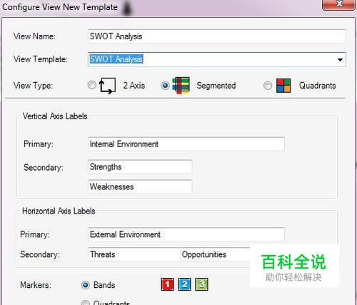 注:视图名称:输入视图名称作为该视图的标题。 视图模板:可以选择已有模板预定义的配置设置,也可以自定义设置。 视图类型:决定轴的配置情况,2-轴及分段视图允许通过条带定义象限或主观分组。(条带以对角形式将图标分为3个区域,用于应用标记,而象限视图则将图标分为4个区域)。 轴标签或者象限标签:定义想法等级的标准或者2-轴视图的箭头方向。 标记:选择想要应用到主题上的标记,这些标记通过主题在视图中的位置自动添加,可以选择当前主题标记列表中任意标记。如果你的视图类型可以使用条带,选中条带,选择3个标记(从左下到右上指定),如果视图类型是象限,可以选择4个标记。