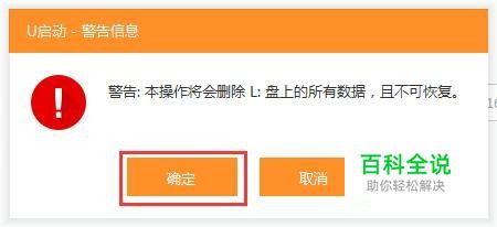 此时,弹出的警告窗口中告知会清除u盘上的所有数据,请确认u盘中数据是否另行备份,确认完成后点击“确定”