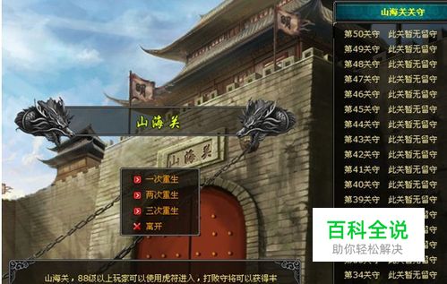 第一,自山海关更新之后,受到了很多玩家的青睐,那么究竟山海关是一个怎么样的玩法呢?下面就由小菜来为大家简单介绍一下。 玩家达到88级之后就可以从世界地图右上角方向的建州地图进入,看到山海关点击进入选取重生机会之后就可以挑战山海关了,如图: