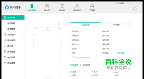 安装完成之后我们使用手机连接电脑,打开PP助手会自动下载ITunes,如果电脑没有话,之后就可以识别设备了,成功之后会显示下面的主界面,你可以查看到设备的各种信息。
