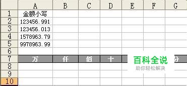 首先看下表,我们要实现的目的,就是将A列中的实数型的金额小写,将其对应的金额数字填写到下方的万仟佰拾元角分对应的位置。