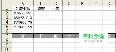 要想解决这个问题,一口气是很难咽得下去的,除非您对函数公式相当了解。最简单的解决办法是,先将实数金额中的整数和小数部分,分别取出来,之后,再作下一步的打算。如下图一样,增加两列,分别是整数和小数,用于保存取出来的整数和小数部分。 一、先取金额中的整数和小数部分