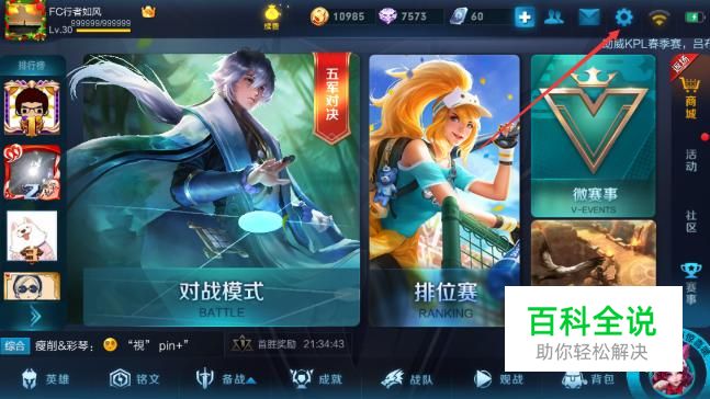 在王者荣耀游戏中,玩家想要查询自己的禁赛记录,首先点击右上角的设置图标。