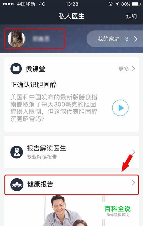 导入体检报告: 图为登陆后首页,左上角会显示登录人的姓名,查看报告点击“健康报告”,图中箭头所示。