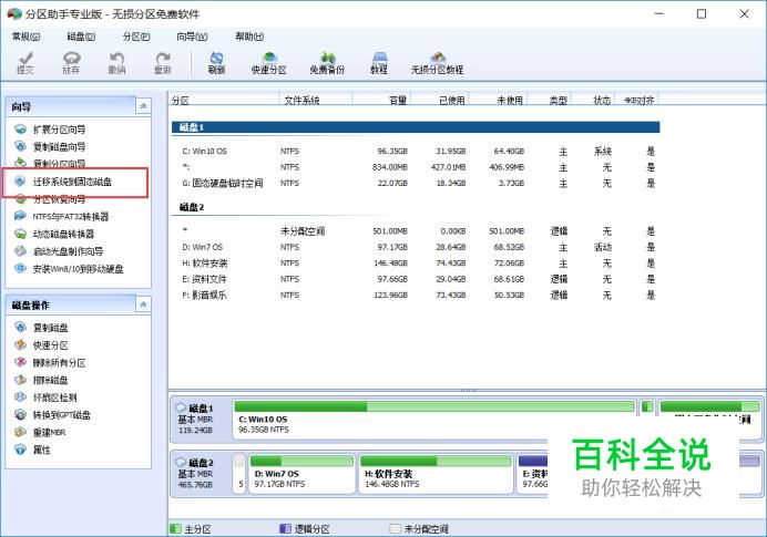 这里以分区助手软件为例,打开分区助手软件,点击页面左侧“迁移系统到固态硬盘”选项。