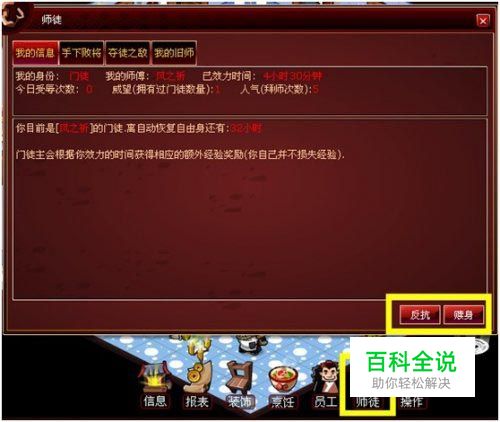 ●烹饪菜肴:开始此项工作后,在工作期间内,可以在烹饪面板中使用该名门徒进行烹饪 ●招待顾客:开始此项工作后,在工作期间内,可以对客栈的客流量产生加成效果 ●材料采购:开始此项工作后,在工作期间内,可以降低客栈内菜肴的菜肴成本 ●经验交流:开始此项工作并完成后,可以增加客栈内所有员工的能力值 ③解救门徒 ●门徒可以通过每日反抗,或者赎身来自动脱离门徒身份;赎身需要花费元宝●门徒的好友如果想解救门徒,必须先击败他的师傅,然后再选择释放该门徒。