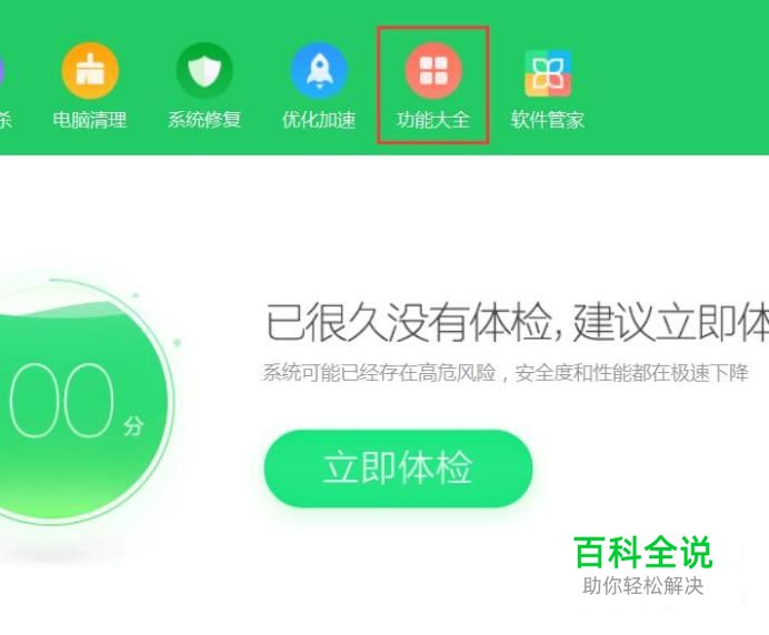 这里以安全卫士类应用为例,打开安全卫士类软件主页面,点击“功能大全”菜单选项。