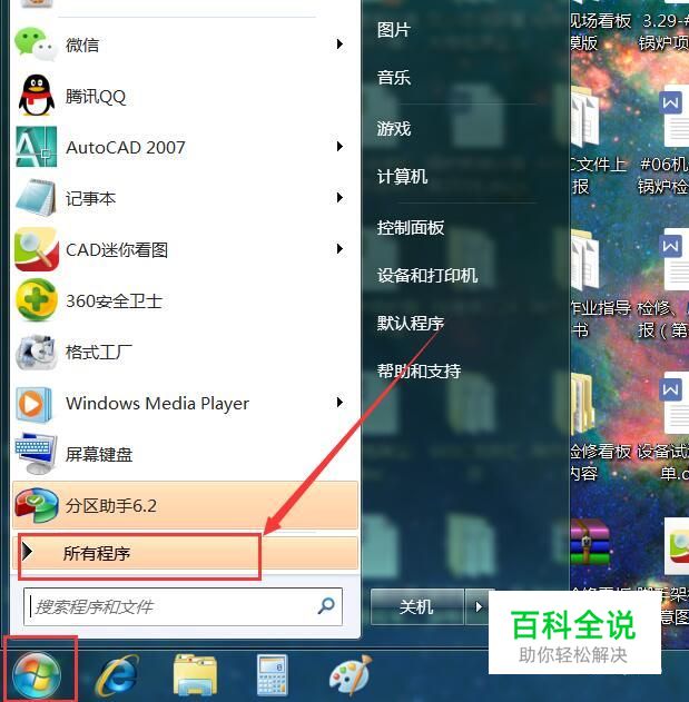 首先,在点击Windows桌面左下角的“开始菜单”按钮,在弹出的菜单中,选中了“所有程序”选项。