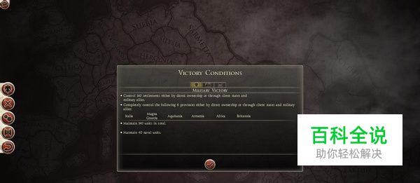 罗马2:全面战争军事胜利条件详解: 三种胜利条件(跟文明5很像),第一为军事胜利(由上而下说明): 【1】通过直接,傀儡或军事联盟控制140个定居点。 【2】通过直接,傀儡或军事联盟控制一下6个省份(如图,不列举)。 【3】维持140个陆上单位。 【4】维持40个海上单位。