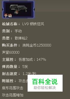 枪魂钢铁狂风枪械属性介绍 散弹枪系列 枪械名称: LV9 钢铁狂风 类别: 手动 类型: 散弹枪2 购买条件: 消耗金币1250000 声望60000 主属性: 伤害加成:147% 弹药数量: 5发 射击速度: 1.2发/秒 附属性: 攻击多个敌人 扇形范围攻击 攻击范围增加