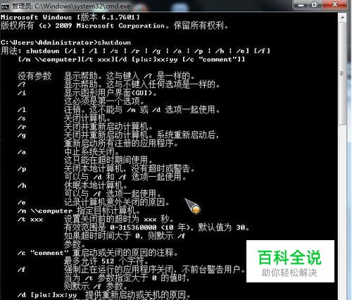 输入命令“shutdown”或者“shutdown /?”后按回车,便可以查看到shutdown命令的使用方法,界面如下: