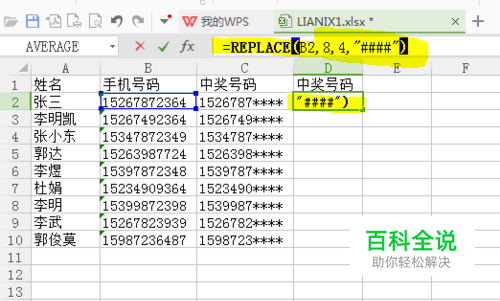 在需要显示隐藏手机号码的单元格输入函数公式,其公式如下图所示,代表的是手机号码后4位用*号代替。