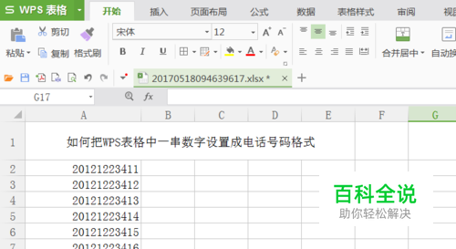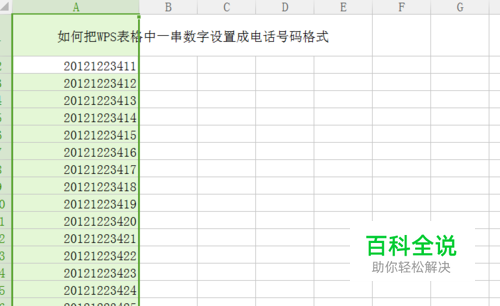 打开WPS表格,然后选中需要编辑的电话号码所在的列,如图所示的“A列”。