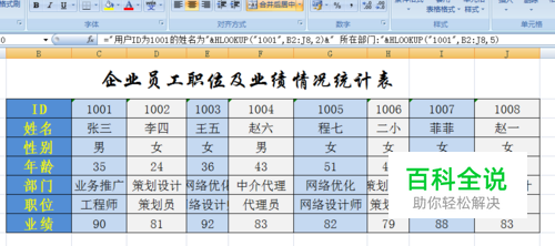 另外,我们可以重复使用HLOOKUP函数,我们可以通过ID获得某一用户的基本信息,例如想获取“ID”为“1001”用户的基本信息,可使用公式“="用户ID为1001的姓名为"&HLOOKUP("1001",B2:J8,2)&" 所在部门:"&HLOOKUP("1001",B2:J8,5)”来实现。