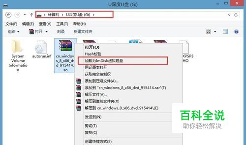 进入到win8pe系统后,打开“计算机”,找到U盘中的win8镜像文件,右键点击,选择“加载为imdisk虚拟磁盘”,如图所示: