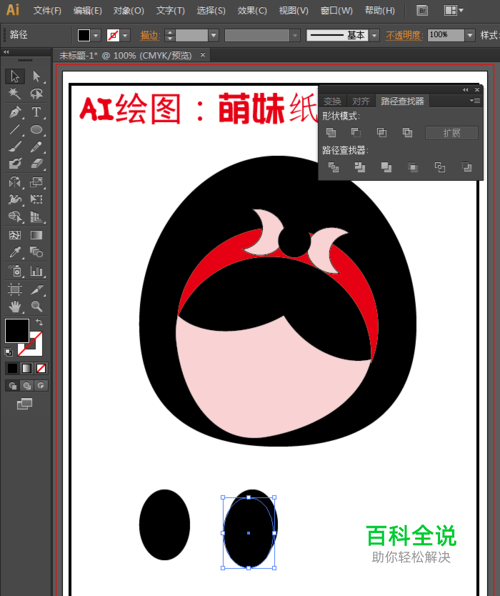 我们再来绘制嘴巴。先选择工具箱中的椭圆工具,将填充设置为黑色,描边设置为无,画一个椭圆;椭圆画好后,再选择工具箱中的矩形工具,绘制一个矩形;然后选中整体,执行菜单栏中的窗口—路径查找器,在形状模式中选择交集。