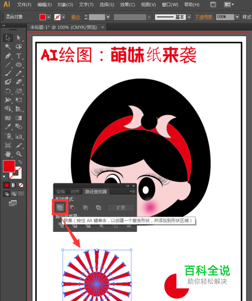 选中整个旋转得到的图形,右键单击,找到编组。再选择工具箱中的椭圆工具,按住shift+Alt键,由中心绘制出一个正圆。再选择工具箱中的选择工具,按住Alt键,复制一个出来,选中左边的部分,执行窗口—路径查找器,打开路径查找器选择联集