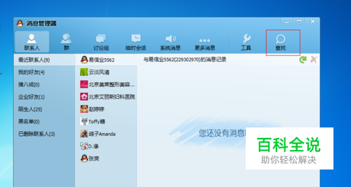选择QQ下方的小喇叭按钮,打开QQ消息管理器。点击右侧放大镜按钮,即搜索按钮。