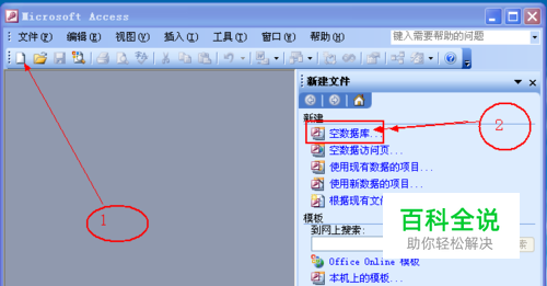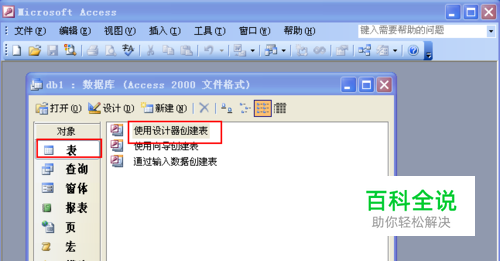 新建空白数据库db1.mdb,打开数据库面板,点击对象工具栏中的表,打开使用设计器创建表”