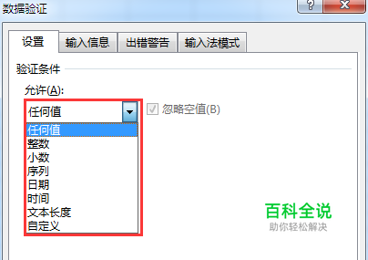 数据有效性主要有以下几种格式,以针对不同的设置需求。 A. 任何值,即没有限制,可在选定的单元格内输入任何值,包括空; B. 整数,即在选定的单元格内只能输入整数数值,其他格式无法输入; C. 小数,即在选定的单元格内只能输入小数数值,其他格式无法输入,由于整数也可以看作是小数点后为0的小数,因此,在此设置下也可以数据整数数值。同时,除了可以输入固定的数值,Excel还未我们提供了“介于”、“大于”、“小于”等多种数值范围选取方式供我们选择。 D. 序列,即只能输入引用的规定的一个序列的数据,既可以在“来源”输入框中输入引用数据的位置,也可以手动输入各种选项,各选项中间以逗号隔开(英文状态下的逗号)。 E. 日期,即只能输入日期格式,标准格式为:yyyy/m/d F. 时间,即只能输入时间格式,标准格式为:h:m:s G. 文本长度, 即只能输入限定字符数范围内的文本数据