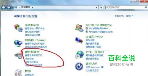 在控制面板中选择“硬件和声音”这个选项