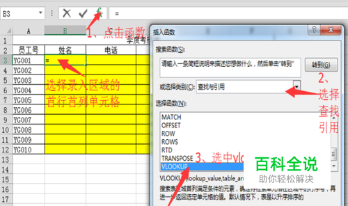 b表中的姓名、电话、年龄信息我想自动读取a表中已有信息(条件是与员工号相同) 选择数据录入区域的首个单元格-点击函数-选择查找与引用-选中vlookup点击确定