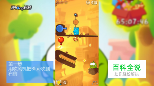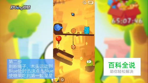 割断绳子,木头运动到Blue时迅速点击Blue使糖果吃到第一颗星星