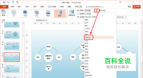 步骤二 继续在【切换】选项卡下,单击【声音】右侧的按钮,在展开的列表中选择要应用的声音效果,如下图所示。