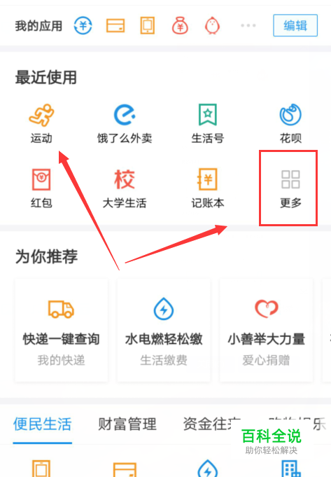 要用支付宝捐步数,就要知道捐赠步数是属于哪个模块的。捐步是属于运动模块的,所以我们要先找到运动模块,下图是打开支付宝之后进入的首页面,没有发现运动模块,点击“更多”