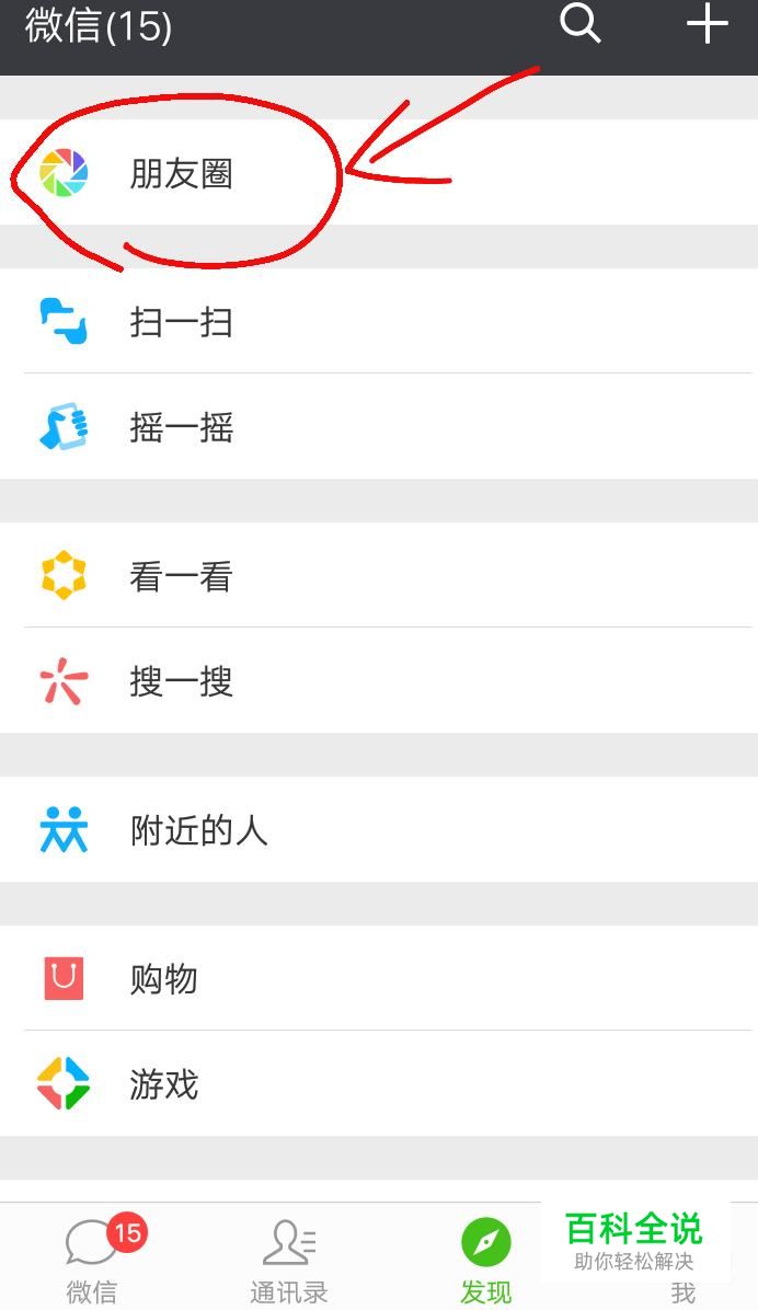 进入微信先点击“发现”,可以看到里面有“朋友圈”