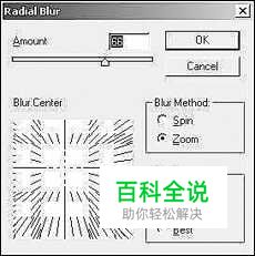 对于新复制的那层,打开菜单Filter/Blur/Radial(滤镜/模糊/镜像模糊),Amount参数设置模糊程度,Blur Center选择模糊的中点,Blur Method选Zoom,设置好参数后点击OK。 图3