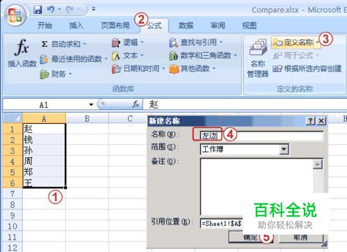 我们选中 (左) 列中所有的数据(这里位于第一张数据单的 A 列),然后选公式选项卡 -> 定义名称 -> 名称中填上“左边”-> 按确定退出。