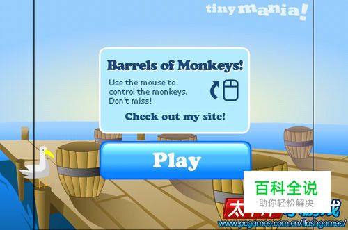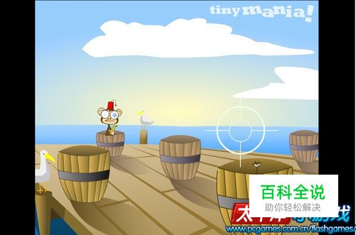 这群调皮的猴子真是捣蛋鬼,它们偷了香蕉躲到木桶内,现在你就等它把头伸出来时射击它,射到了就可以拿回香蕉,