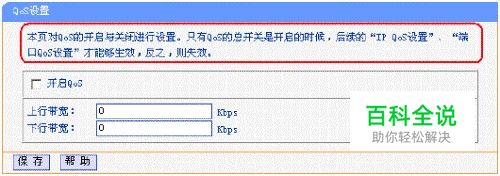 进入路由器管理界面,进入IP与带宽控制。开启IP带宽控制功能,并输入上行和下行的带宽速率(总的带宽)。 QoS Set界面如下图