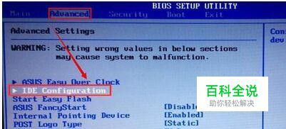 开机连续不断按f2按键进入bios(其它电脑进入bios的按键可以观察电脑开机时相应提示),进入bios主界面后,按“→”键到advanced选项,再按“↓”键到ide configuration项回车,