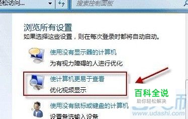 在开始框里面输入轻松访问中心之后按“回车键”确认之后会进入浏览所有设置控制面板,找到“浏览所有设置”,之后单击“使计算机更易于查看”如下图: