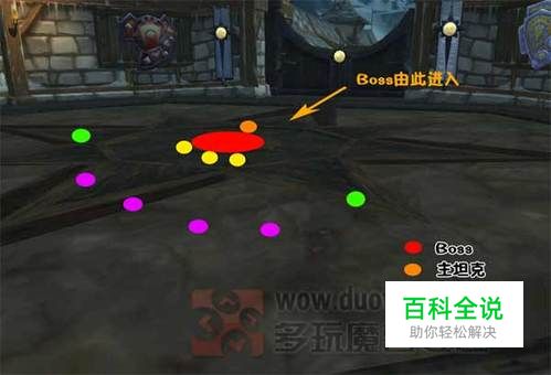 击杀攻略 其中红色骷髅是Boss的位置,黄点、蓝点和绿点是团队成员(分散站位)。红点为两个坦克,分别拉住酸喉和恐鳞。其中,黄点代表近战,蓝点代表远程输出,而绿点则是治疗职业。