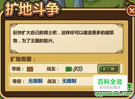 32级扩地需要:战友46个或者以上。现在想买个无限制扩地道具,但是太贵了买不起。如果现在我购买无限制扩地道具,那么是不用进行扩地战争的。