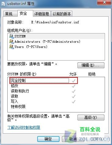 右键单击“usbstor.inf”文件,在弹出的对话框中切换奥“安全”选项卡,将系统默认的组或用户“SYSTEM”的“完全控制”权限设置为“拒绝”。 将对应的组或用户的完全控制权限设置为“拒绝”