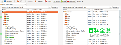 提示 1:如果你仔细观察,就会看到 Meld 窗口的左边和右边有一些小条。这些条的目的是提供“简单的用颜色区分的比较结果”。对每个不同的文件/文件夹,条上就有一个小的颜色块。你可以单击每一个这样的小块跳到它对应的文件/文件夹。