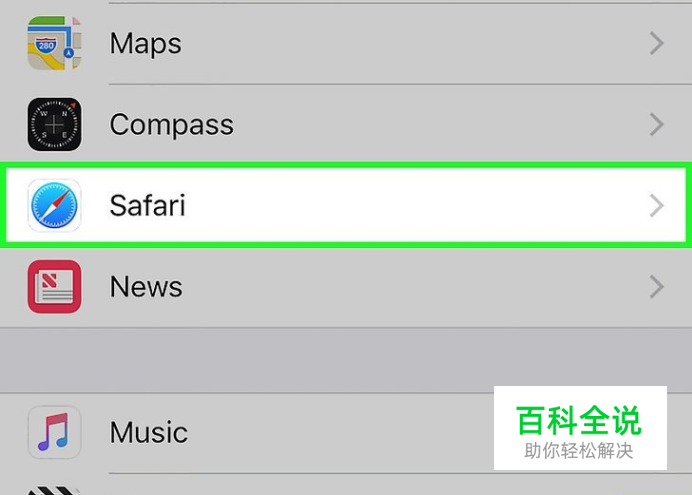 向下滑动页面,点击“Safari”。您应该能从第五组选项中找到它。